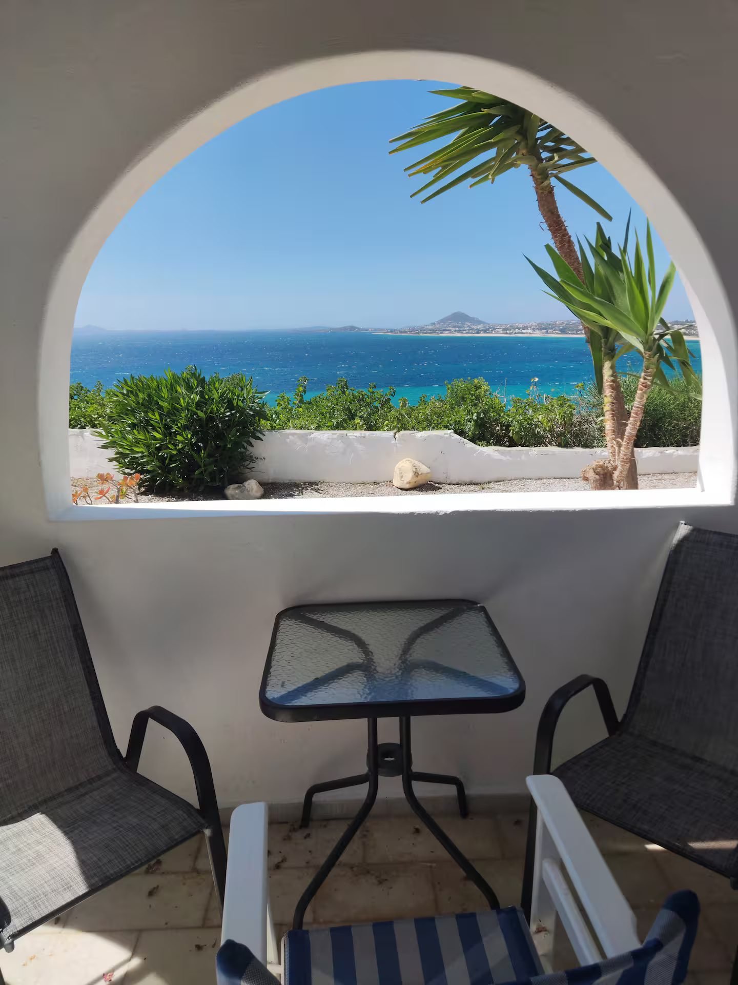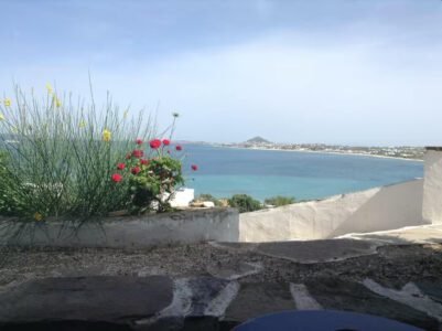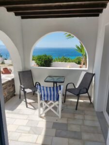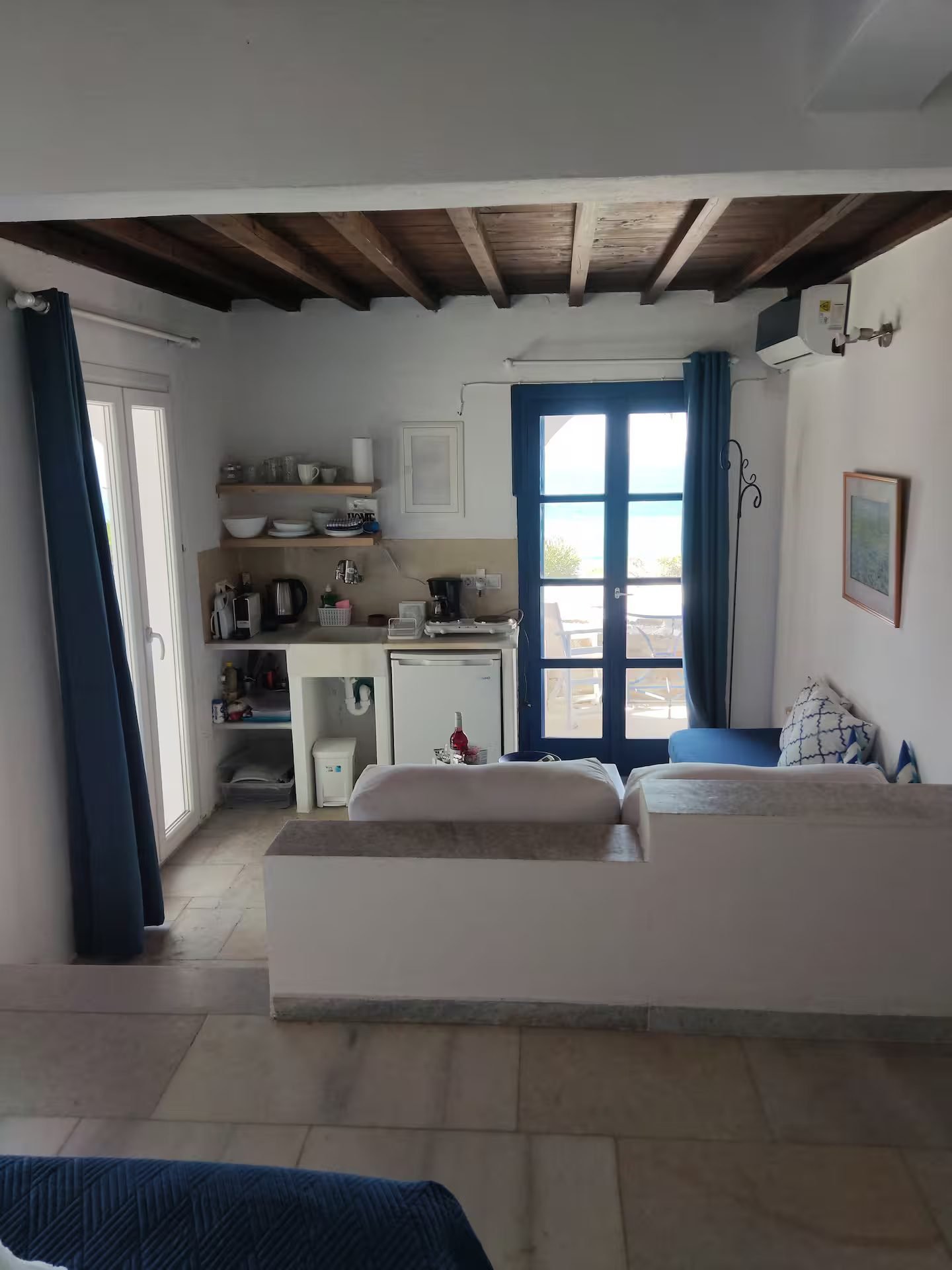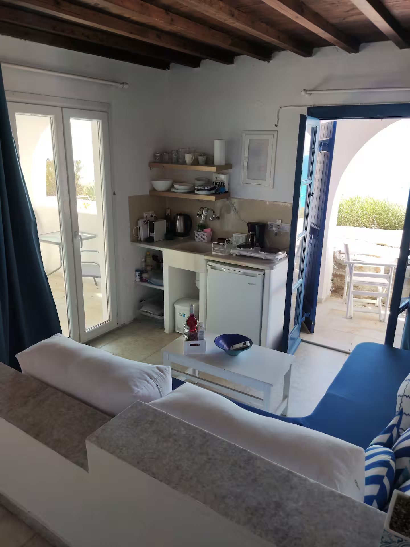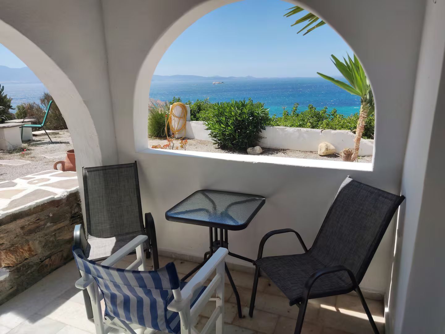 Orkos blue waves 4 is a traditional studio located at Orkos on the island of Naxos. It has 2 private balconies with an amazing unobstructed view of the Aegean sea. Spacious for up to 3 guests with all the amenities you need. The studio has a queen bed, a single bed and extremely fast internet. It has a fully equipped kitchenette with a small fridge. There is private free parking. The most beautiful beaches of Naxos like Orkos, Plaka and Mikri Vigla are 200m away. Mikri Vigla is ideal for windsurfing and kitesurfing. The location is ideal for walking and running. In Mikri Vigla which is a 1km distance from the distance there are restaurants, coffee shops, mini markets and bakeries.